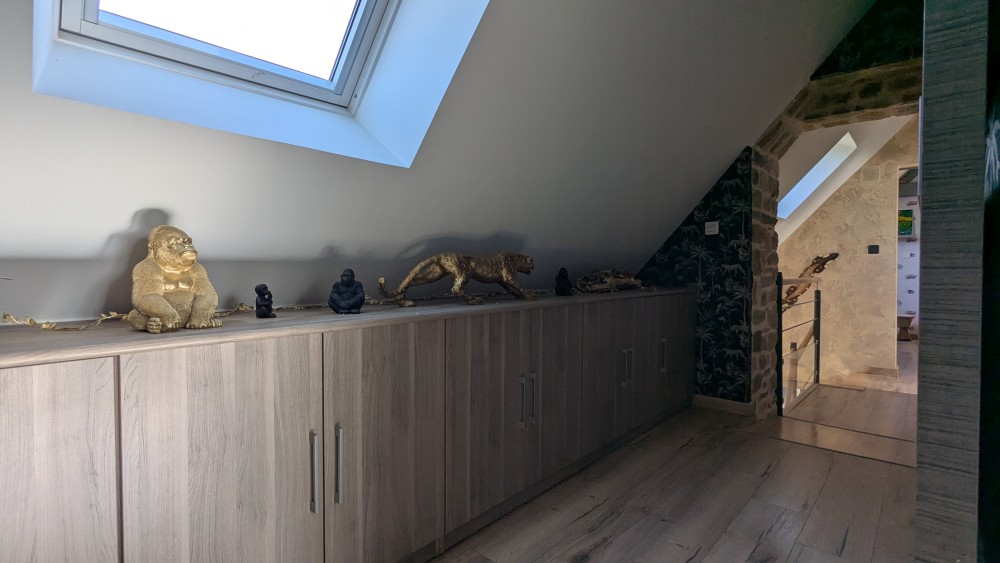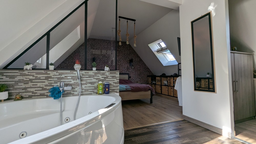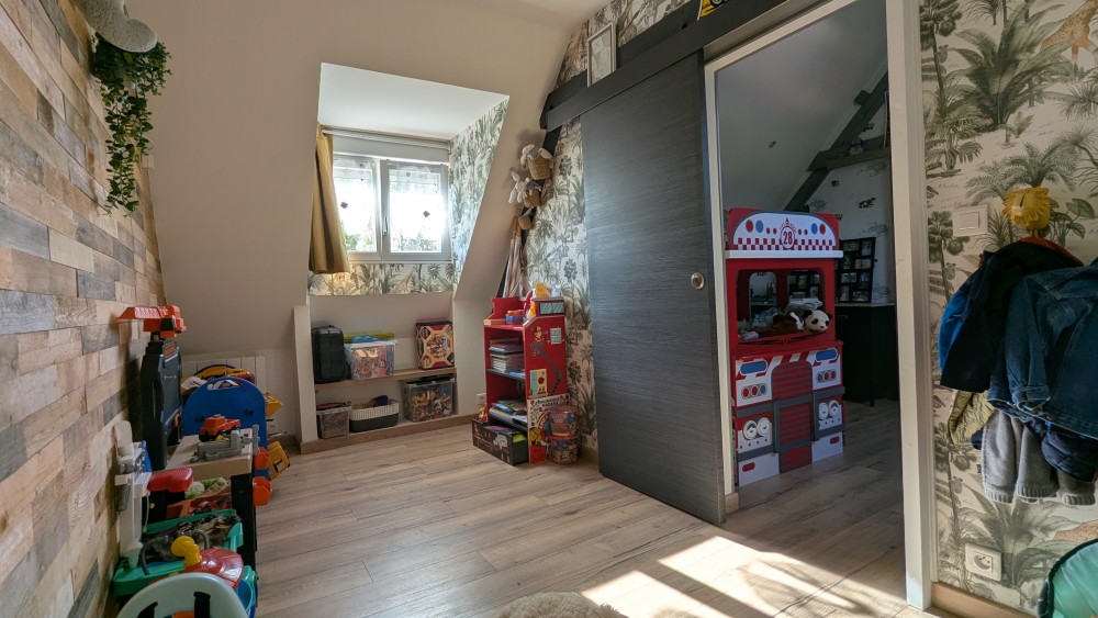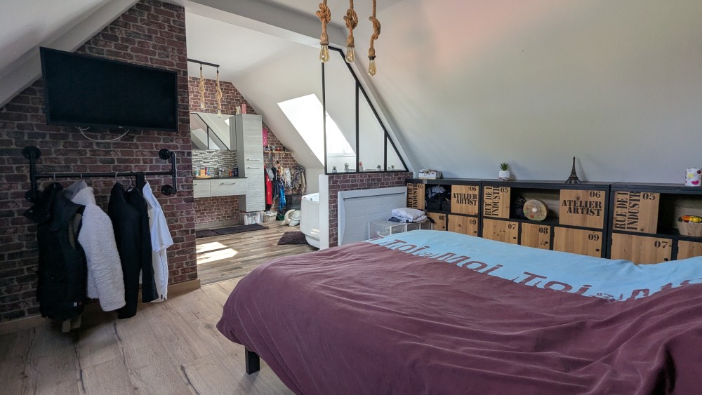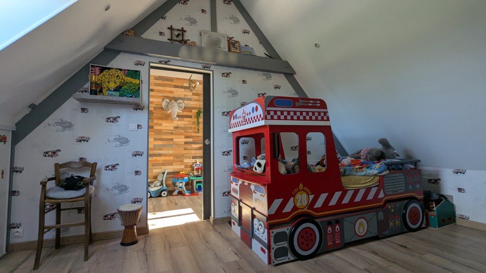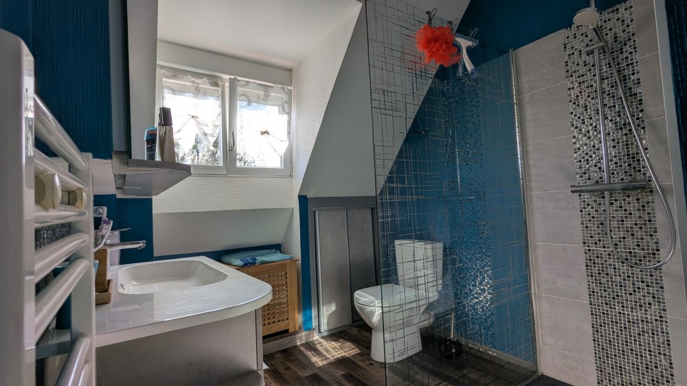 L'étage est composé d'une grande suite parentale avec baignoire, une salle d'eau avec WC et deux chambres en enfilade.