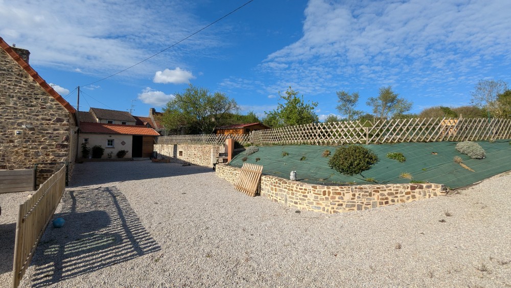 A l'extérieur, une grande cour gravillonnée, un terrain en herbe, un abri de jardin et un grand cabanon complètent l'ensemble.