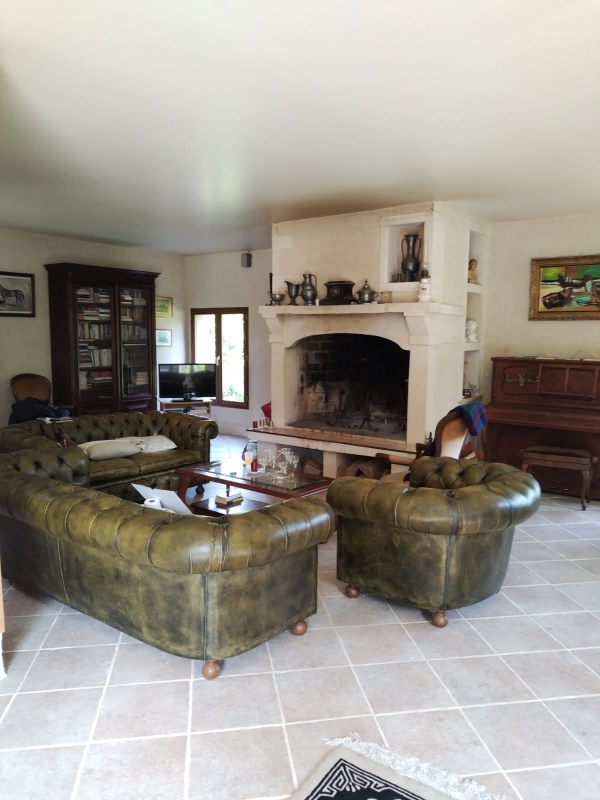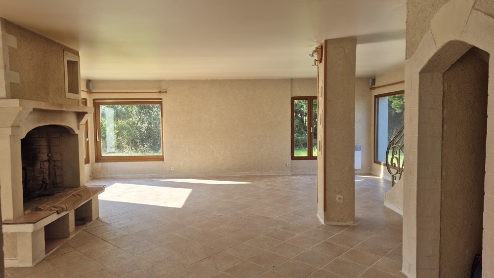 Au RDC: entrée desservant un grand salon de 58m² (cheminée), une salle de bains avec WC, une cuisine avec un séjour, cellier et 2 garages.