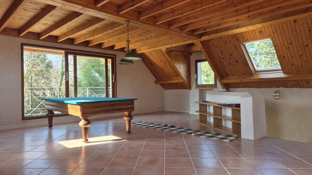 Au 1er étage: belle pièce à vivre de 37m² avec son balcon (+ une pièce mansardée au-dessus), couloir desservant 3 chambres, WC et une salle d'eau et un grenier au-dessus.